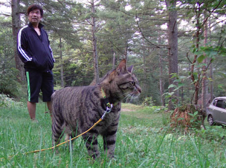 キャンプ場はお盆も過ぎて、私たちだけの貸切状態。愛猫は毎朝のお散歩タイムに大喜びでした。その様はまるで犬のお散歩と一緒。おかしな娘です。