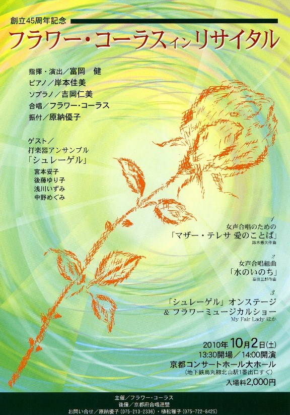この度の『創立45周年記念・フラワーコーラスインリサイタル』の大成功を心からお祝い申し上げます。京都の女声合唱を常に先頭に立ってリードされている貴団にふさわしい素晴らしい演奏会だったことをサポーターの一人として大変嬉しく誇らしく思っており、富岡先生を始めとして、メンバー全員の皆様のご努力に敬意を表します。