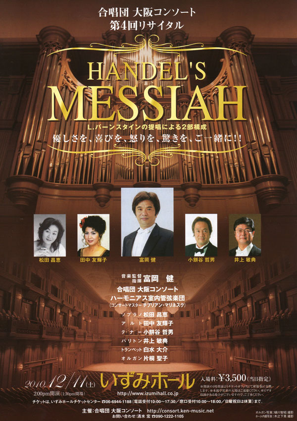 先生がいっぱいの愛情をかけて育てあげられた大阪コンソートさんが、11年の年月を経て、ついにいずみホールで、メサイア演奏会を実現されて、心からお祝い申し上げます。