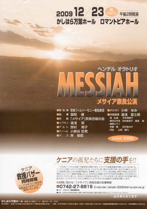 23日はかしわら万葉ホールでのメサイア奈良合唱の会によるメサイア全曲演奏会。初対面の合唱団と奈良フィルハーモニとのほぼ3時間に及ぶ全曲演奏会はかなりの重圧でした。「ケニアに援助を!」という合言葉の元、素晴らしいソリスト(湯浅契・西村規子・小餅谷哲男・岸俊昭)に恵まれて、初めて全曲を指揮することが出来ました。公募によって集まってくださった合唱団の皆さんのご努力と素晴らしい演奏にブラボーです。