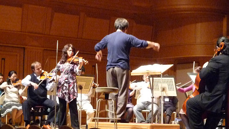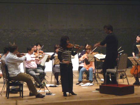 第3ステージは漆原さんのソロでモーツアルト「ヴァイオリン協奏曲第5番」。漆原さんは本番前の2日間もリハーサルにお付きあいくださったのに、一度もカデンツァを弾かれることはなかった。指揮者としてとても不安でした。しかし、さすがに世界の有名オーケストラと共演なさっていらっしゃる方、カデンツアの終わりからオーケストラの全奏を導く箇所は、とても自然な流れを作ってくださり、何の苦もなく棒を振り下ろすことが出来ました。(よかった!!)。漆原さんの音楽は、構築力の高さと高貴な旋律美。まさに漆原さんの「音のオーラと魔力」を一番近いところで味わうことができました。