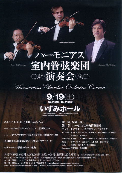19日(土)18:30開演、いずみホールでの「ハーモニアス室内管弦楽団」の旗揚げ演奏会、富岡先生とチプリアンさんの耳にかなった優秀な関西の音楽家たちが揃って披露される、胸躍らされる美しい弦楽の音色に大いに期待を寄せていただき、まだまだチケットもあるようですので、奮って応援、お問い合わせをいただきたく、お願い申しあげます。